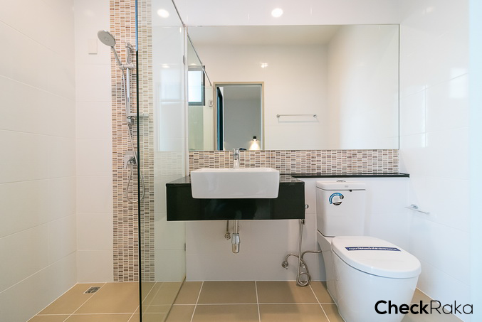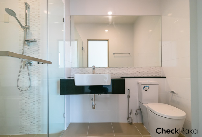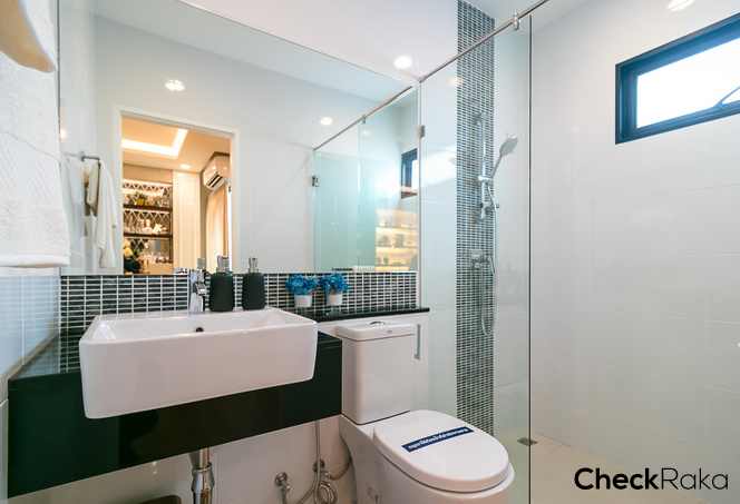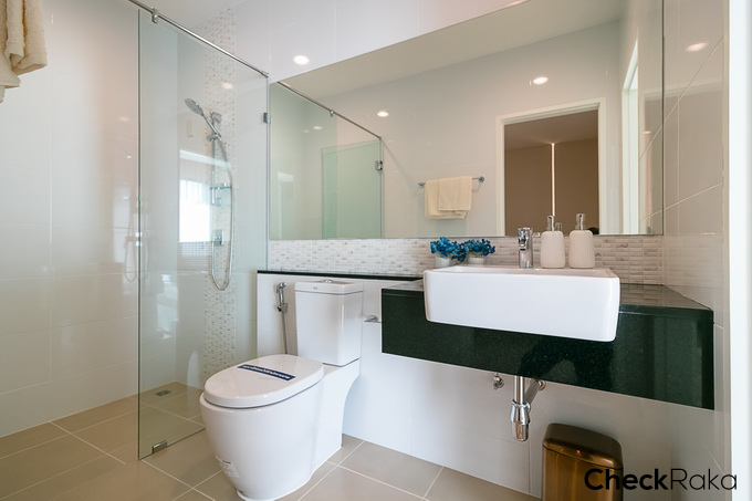 ห้องน้ำชั้น 4 ให้สุขภัณฑ์ครบ ทั้งอ่างล้างมือ ก๊อกน้ำ กระจก โถสุขภัณฑ์ ของ American Standard และแยกส่วนเปียก/แห้งให้ด้วย ฉากกั้นอาบน้ำกระจก Temper ติดตั้งฝักบัว และมีบานกระทุ้งระบายอากาศ 1 บาน