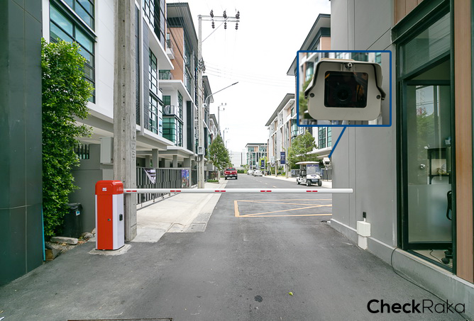 ที่ซุ้มประตูทางเข้าโครงการมีทั้ง รปภ. จุดสแกน ไม้กั้นกระดก และ CCTV มีห้องสำหรับรปภ. กั้นตรงกลางระหว่างทางเข้าและทางออก ควบคุมการเข้าออกด้วยระบบ Access Card
