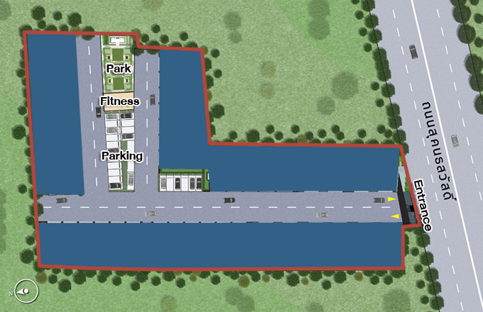 แสดงให้เห็นถึงขอบเขตโครงการโดยรวม ที่ตั้งของบ้าน สวนสาธารณะ ฟิตเนส และทางเข้า-ออก