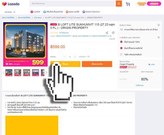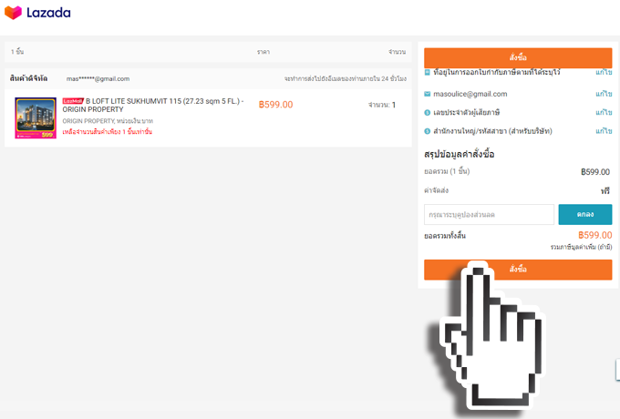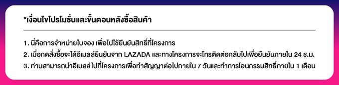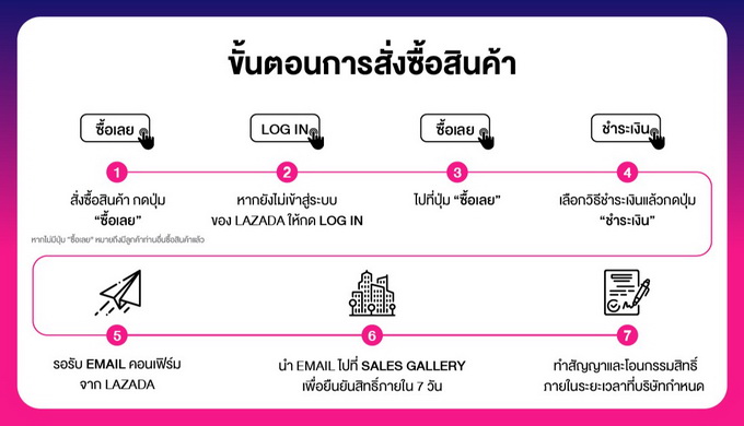 เมื่อกดสั่งซื้อจะได้อีเมลยืนยันจาก Lazada และทางโครงการจะติดต่อกลับไปเพื่อยืนยันภายใน 24 ชม. ให้นำอีเมลไปที่โครงการเพื่อทำสัญญาต่อไปภายใน 7 วัน และทำการโอนกรรมสิทธิ์ภายใน 1 เดือน