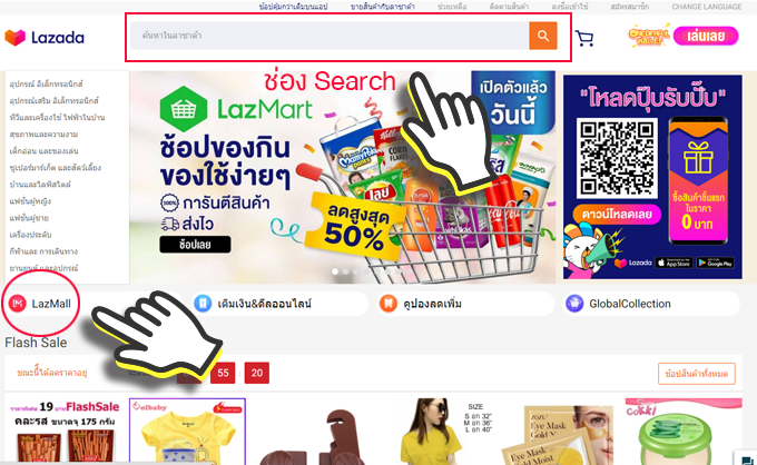 พอได้ Account มาแล้ว เราก็สามารถช็อปปิ้งออนไลน์ได้อย่างสบายใจ หน้าแรกของ Lazada จะมีรวมสินค้าหลายๆ อย่าง ของหลายๆ ร้านไว้ด้วยกัน แต่จะมีในส่วนที่เรียกว่า LazMall ที่เป็นฟังก์ชันของทาง Lazada ทำไว้รองรับพวกแบรนด์ใหญ่ๆ หรือ "ร้านค้าทางการ" เอาไว้ ซึ่งทาง "ออริจิ้น พร็อพเพอร์ตี้" และ "แสนสิริ" ก็อยู่ในหมวดของ LazMall ด้วย นอกจากนี้ เรายังสามารถค้นหาร้านค้าทั้งสองได้จาก Tab Search ตามภาพด้านล่างนี้ได้เลยค่ะ