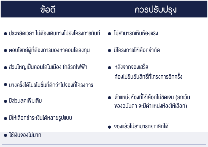 การเลือกซื้อบ้าน หรือคอนโดผ่านระบบออนไลน์ก็มีทั้งข้อดีและข้อควรปรับปรุงในตัวของมันอยู่แล้ว สำหรับใครที่ชอบช็อปปิ้งออนไลน์ก็อาจจะมองว่ามันสะดวกดี แถมยังรวดเร็ว แต่ในอีกด้านหนึ่ง การที่เราไม่เห็นของ ไม่ได้ไปดูของจริงว่าเป็นอย่างไร ก็อาจจะทำให้การตัดสินใจอะไรบางอย่างของเราผิดพลาดไปได้ แต่อย่างไรก็ตามเดี๋ยวนี้ก็มีเว็บไซต์ที่รีวิวห้องคอนโด และให้ข้อมูลเกี่ยวกับคอนโดอยู่มากมาย ซึ่งอาจจะพอช่วยให้ข้อมูล และการตัดสินใจของเราหนักแน่นขึ้น (เช็คราคา.คอมก็มีรีวิวเยอะแยะเลยนะ อิอิ) และเชื่อว่าในอนาคต น่าจะมีหลากหลายบริษัทที่หันมาเปิดระบบให้จองออนไลน์มากขึ้นด้วยค่ะ