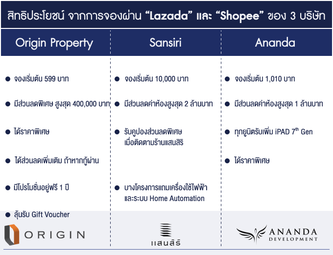 ทั้ง 3 บริษัท "ออริจิ้น พร็อพเพอร์ตี้", "แสนสิริ" และ "อนันดาฯ" ต่างก็มีโปรโมชั่นพิเศษสำหรับการจองออนไลน์ผ่าน LazMall และ Shopee ด้วยกัน แต่ทั้งนี้เนื่องจากโปรโมชั่นมีการเปลี่ยนแปลงอยู่เสมอ โปรโมชั่นที่เรานำมาเสนอด้านล่าง อาจจะยังไม่อัปเดต ซึ่งต้องติดตามข่าวสารจากทางร้านค้าอยู่บ่อยๆ กันด้วยนะคะ