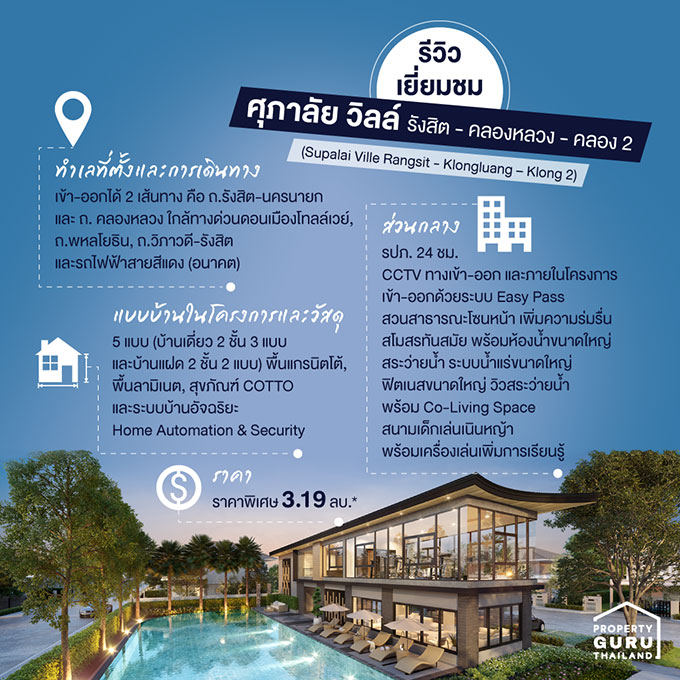 สวัสดีค่ะ สำหรับรีวิวบ้านรอบนี้ขอพาไปชมบ้านโครงการใหม่ จาก ศุภาลัย นั่นก็คือ "ศุภาลัย วิลล์ รังสิต - คลองหลวง - คลอง 2 (Supalai Ville Rangsit - Klongluang - Klong 2)" มีแบบบ้านให้เลือกหลากหลาย ทั้งบ้านเดี่ยว บ้านซีรีย์ใหม่ บนทำเลรังสิต-คลองหลวง-คลอง 2 ไม่ไกลจากถนนสายหลัก (ถ.รังสิต-นครนายก, ถ.พหลโยธิน, ถ.คลองหลวง, ทางด่วนดอนเมืองโทลล์เวย์) รวมถึงรถไฟฟ้าสายสีแดง (บางซื่อ-รังสิต) ที่จะเปิดใช้ในปี 2564 นี้ และยังรายล้อมไปด้วยสถานที่สำคัญ โรงเรียน, โรงพยาบาล และห้างสรรพสินค้า ไปดูรายละเอียดของโครงการเพิ่มเติมกันต่อดีกว่าค่ะ