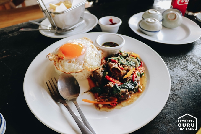 อาหารตามสั่งก็มีนะคะ รสชาติอร่อย อย่างจานนี้เป็นกะเพราเนื้อไข่ดาว ฝากท้องได้ทุกมื้อเลยทีเดียวค่ะ