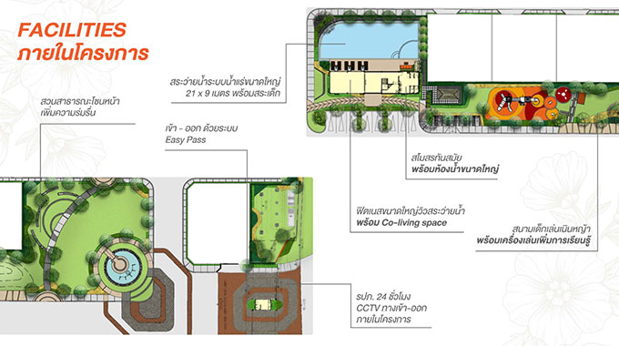- สิ่งอำนวยความสะดวก : สระว่ายน้ำ, ฟิตเนส, สโมสร, สวนส่วนกลางพร้อม Play Zone+สนามเด็กเล่น, ระบบรักษาความปลอดภัยตลอด 24 ชม. เข้า-ออกด้วยระบบ Easy Pass และ CCTV