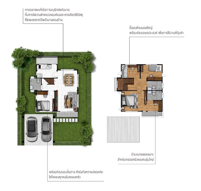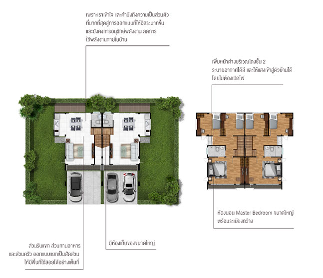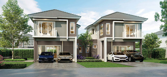 - มีแบบบ้านทั้งหมด : 5 แบบ (บ้านเดี่ยว 2 ชั้น 3 แบบ และบ้านแฝด 2 ชั้น 2 แบบ)