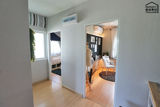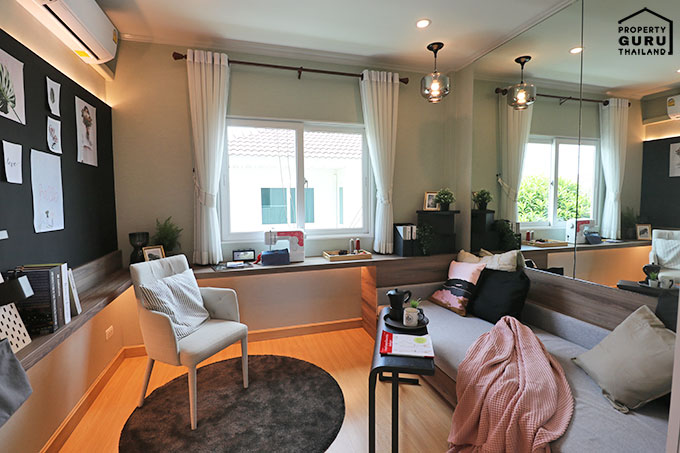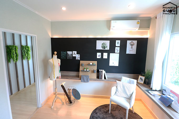 ห้องนอน 2 บ้านตัวอย่างตกแต่งเป็นห้องทำงาน พื้นที่กว้างทีเดียว พร้อมด้วยหน้าต่างบานเลื่อน