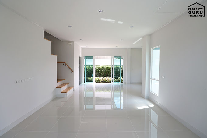 เข้ามาในตัวบ้าน พื้นเป็นกระเบื้องแกรนิตโต ผนังบ้านฉาบเรียบ ทาสีขาว
