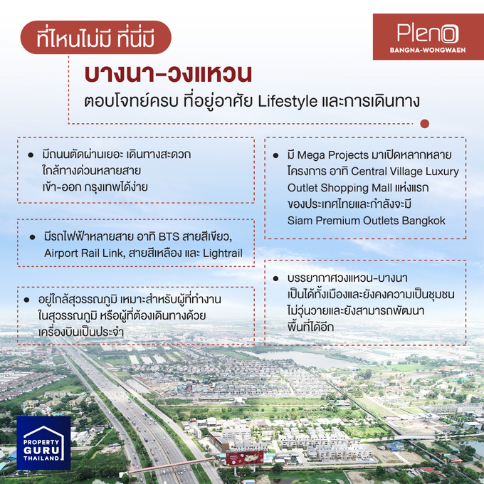 ทำเล "บางนา-วงแหวน" ทำเลยอดฮิตของคนหาบ้านจนทำให้ทำเลนี้มีโครงการหมู่บ้านจัดสรรเปิดอยู่หลากหลายโครงการ และ "Pleno บางนา-วงแหวน" ก็เป็นโครงการที่น่าสนใจบนย่านนี้ ไม่เพียงเท่านั้น นักลงทุนด้านอื่นๆ ก็นิยมมาเปิด Mega Projects กันอย่างคับคั่ง ทั้งในเรื่องของการเปิด Luxury outlet shopping Mall แห่งแรกในประเทศไทยอย่าง Central Village และยังจะมีรถไฟฟ้า Lightrail บางนา-สุวรรณภูมิ ที่จะมาช่วยเชื่อมการเดินทางไปยังสุวรรณภูมิได้ทั่วถึงมากขึ้น ทั้งหมดนี้หาได้ที่ "บางนา-วงแหวน" และยังมีอะไรอีกมากมายที่น่าสนใจในย่านนี้ วันนี้ เช็คราคา.คอม จะพาไปดูว่า "บางนา-วงแหวน" มีอะไรที่ทำเลอื่นไม่มีบ้างค่ะ