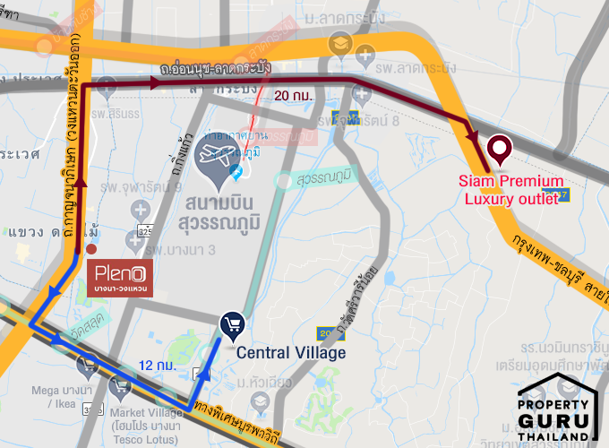 แผนที่เส้นทางการเดินทางจากโครงการไปยัง Central Village และ Siam Premium Outlet Bangkok
