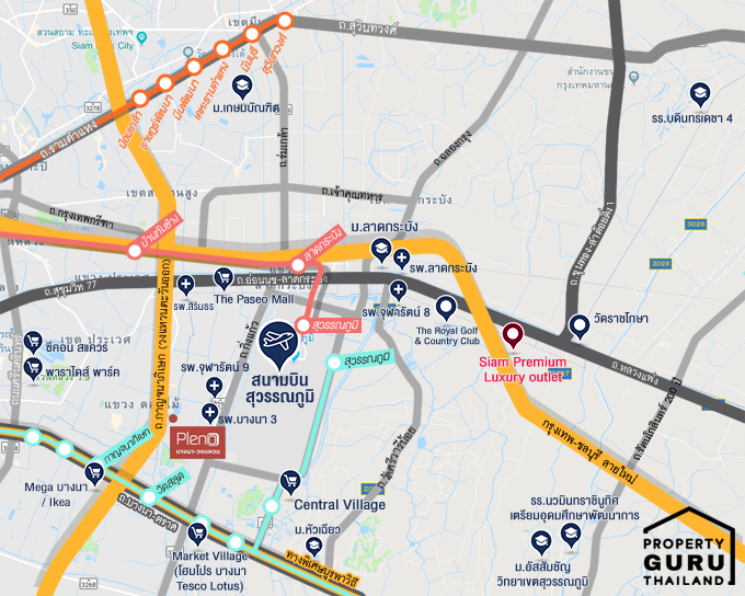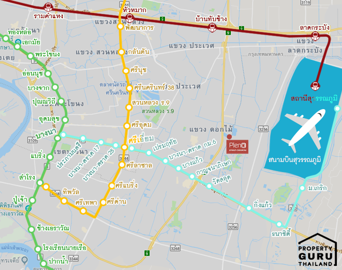 แผนที่รถไฟฟ้าทั้ง 4 สายที่อยู่ใกล้โครงการ โดยมีสถานที่เชื่อมต่ออยู่ที่ สถานีบางนา, สถานีศรีเอี่ยม, และสถานีสุวรรณภูมิ