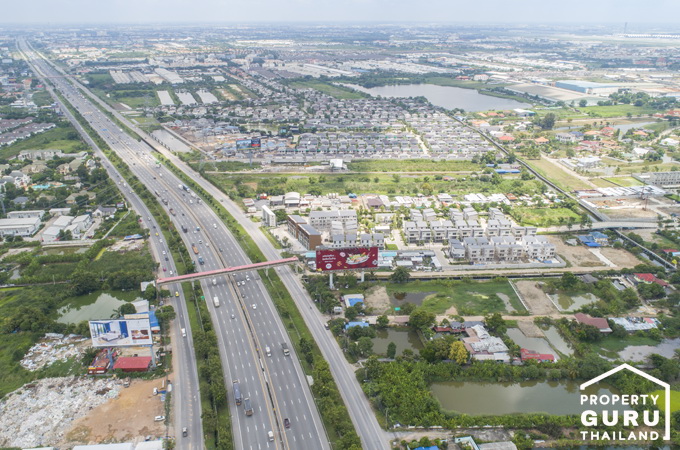ภาพมุมสูงบริเวณถนนวงแหวนด้านหน้าโครงการ "พลีโน่ บางนา-วงแหวน" จะเห็นว่าพื้นที่ส่วนใหญ่เป็นพื้นที่แนวราบ