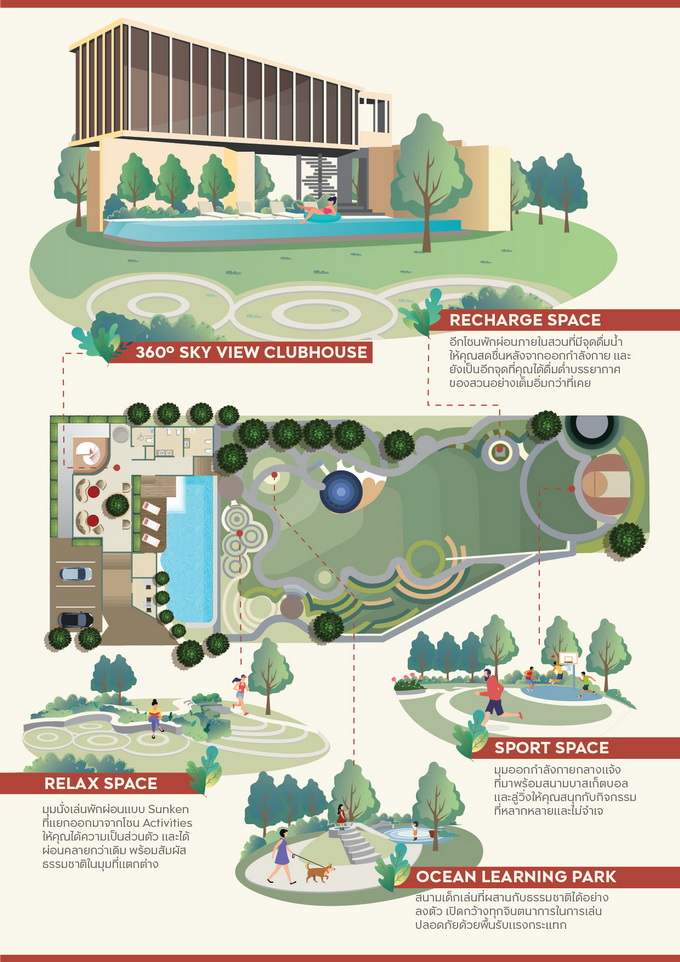 นอกจากความสบายของตัวบ้านแล้ว โครงการยังจัดพื้นที่ส่วนกลางและสิ่งอำนวยความสะดวกมาให้อย่างเต็มที่ ทั้ง Clubhouse ขนาดใหญ่ มาพร้อมสระว่ายน้ำ และฟิตเนส ในส่วนของสวนสาธารณะ ได้แบ่งฟังก์ชันการใช้งานอย่างเป็นสัดส่วนและเชื่อมต่อกันอย่างลงตัว โดยมีทั้งหมด 4 โซน ได้แก่ Relax Space, Sport space, Recharge Space และ Ocean Learning Park ซึ่งมีการผสมผสานพื้นที่ออกกำลังกายและพื้นที่พักผ่อนได้อย่างลงตัว อาทิ Ocean Learning Park สนามเด็กเล่นที่ช่วยเสริมสร้างทักษะ, Basketball Court ลานสนามบาสเก็ตบอลดีไซน์ใหม่, Multi-Function Lawn ลานกิจกรรมอเนกประสงค์, Recovery Zone พื้นที่ผ่อนคลายกล้ามเนื้อหลังจากออกกำลังกาย, และ Recharging Sunken Bench พื้นที่นั่งเล่นพักผ่อนแบบ Sunken แยกส่วนจากพื้นที่ออกกำลังกาย มอบความเป็นส่วนตัวในการพักผ่อนท่ามกลางธรรมชาติ ทั้งหมดนี้ AP ออกแบบมาอย่างใส่ใจผู้อยู่อาศัย ซึ่งจะรองรับลูกบ้านได้อย่างทั่วถึง และสามารถใช้งานได้อย่างแท้จริง