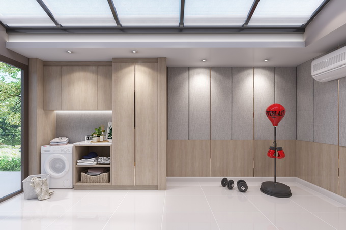 พื้นที่หลังบ้านได้มีการลงเสาเข็มไว้ให้เพื่อรองรับในการต่อเติมของลูกบ้านในอนาคต สามารถทำเป็นพื้นที่ครัวขนาดใหญ่เต็มรูปแบบ พื้นที่ซักล้าง หรือปรับเปลี่ยนเป็นพื้นที่สำหรับออกกำลังกายในบ้านก็ได้ด้วยเช่นกัน ตามภาพตัวอย่างด้านบน