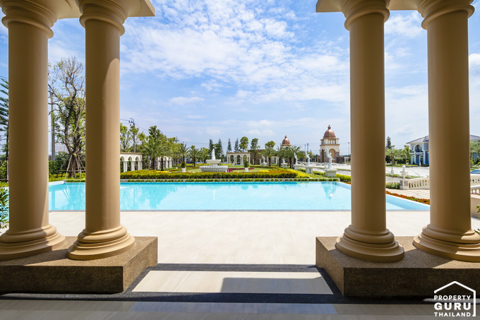 มองจากตัวคลับเฮ้าส์ออกไปที่สระว่ายน้ำ