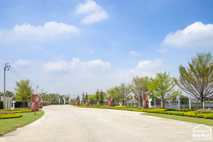 ฝั่งขวาของประตูทางเข้ามีป้ายชื่อโครงการขนาดใหญ่