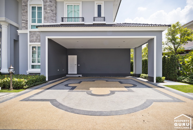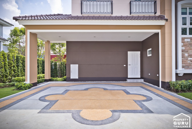 บ้านหลังนี้สามารถจอดรถได้ 3 คัน พื้นที่จอดรถเป็นพื้นซีเมนต์ On Ground ขัดหยาบ มีประตูทางเข้าที่เข้าบ้านได้จาก