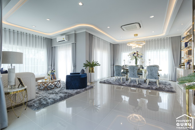 2. VALENCIA - บ้านเดี่ยว 2 ชั้น พื้นที่ใช้สอย 220 ตร.ม. ขนาด 4 ห้องนอน 4 ห้องน้ำ Living Room, Family Area, Multi-Purpose Room, Dining Room, Kitchen, Laundry, ห้องพระ Skylight ที่จอดรถ 3 คัน