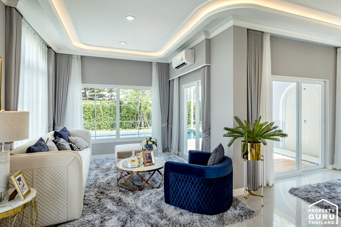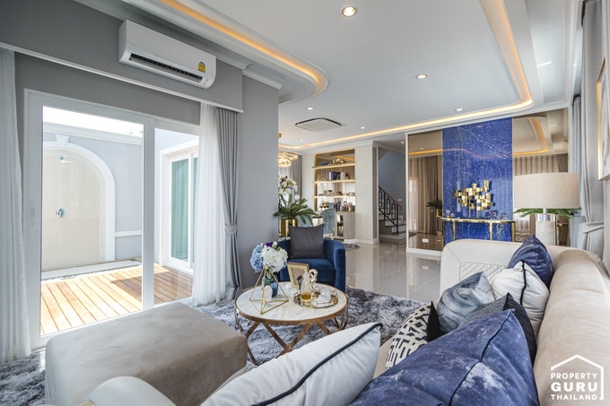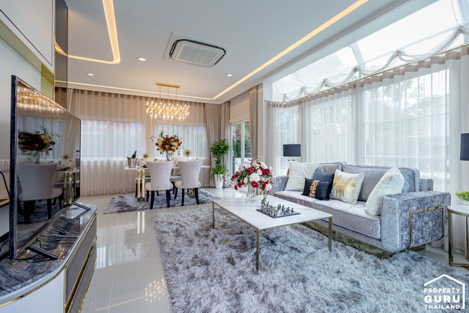 ส่วนพักผ่อนรับแขกที่ทางโครงการจัดไว้ สามารถวางโซฟา ขนาด 3-4 ที่ และมีเก้าอี้ตัวเล็กเพิ่มก็ได้ ด้านหลังโซฟาคือ Skylight หน้าต่างกระจกบานใหญ่ที่ช่วยให้แสงสว่างเข้าตัวบ้าน ตรงข้ามโซฟารับแขก คือพื้นที่วางทีวี