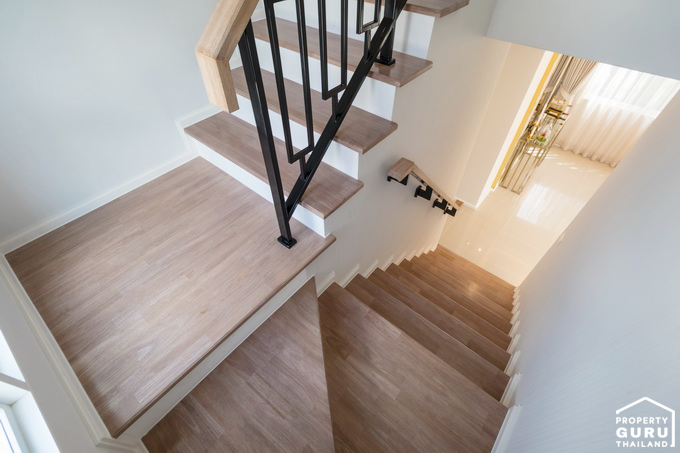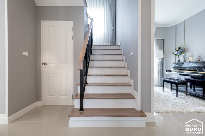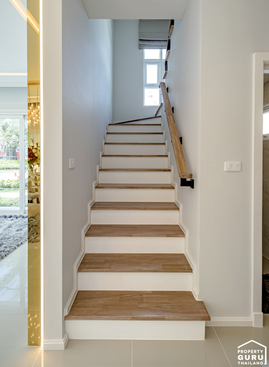 บันไดทางขึ้นของที่นี่จะวางตัวอยู่ตรงกลางบ้านเลย เป็นโครงสร้างคอนกรีตเสริมเหล็ก พื้นบันไดไม้สำเร็จรูป
