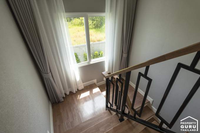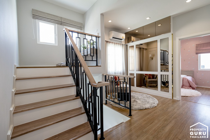ตรงชานพักจะมีกระจก และหน้าต่างบานกระทุ้งเปิดรับแสงและระบายอากาศช่วงบันไดได้