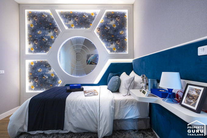 พื้นที่ที่กว้างสามารถวางเตียงขนาดใหญ่และยังมีพื้นที่เหลือให้วางโต๊ะข้างเตียงได้อีกด้วย ปลายเตียงจัดวางโต๊ะวางทีวีแล้วยังเหลือระยะเดินอีกเยอะเลย