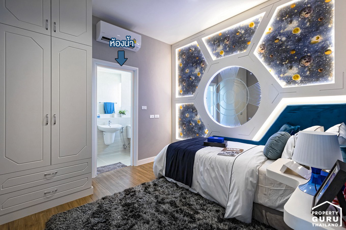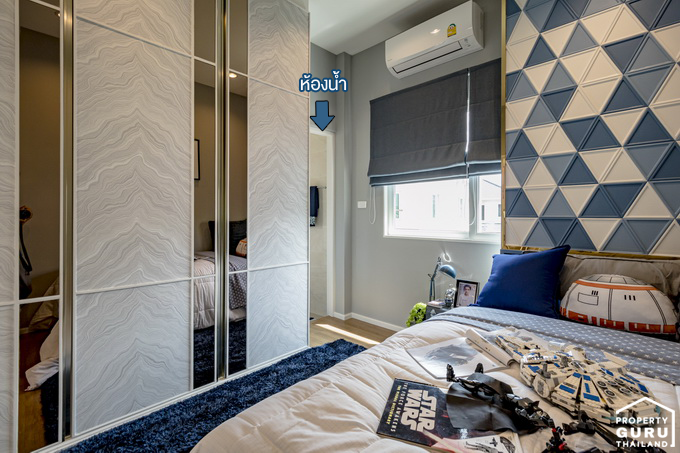 มุมนี้ Built-in เฟอร์นิเจอร์มาให้ แต่บ้านที่ขายจริงเป็นพื้นที่โล่งๆ เลย มีประตูทางเข้าห้องน้ำจากส่วนนี้