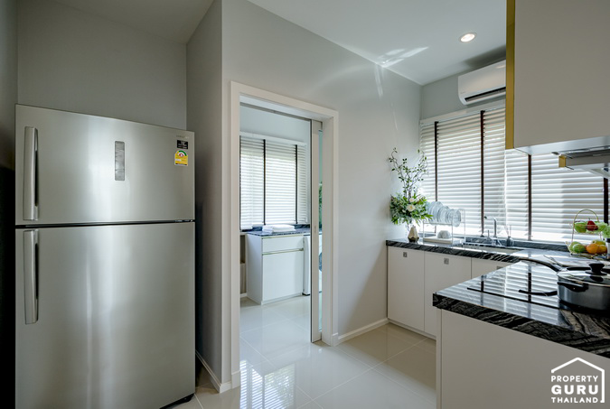 ถัดจากห้องอเนกประสงค์ คือ ทางเข้าห้องครัว ซึ่งเป็นครัวแยก ทางโครงการติดตั้งประตูมาให้ช่วยลดปัญหาเรื่องกลิ่นควันเข้าตัวบ้าน วางตู้เย็นได้ที่มุมนี้