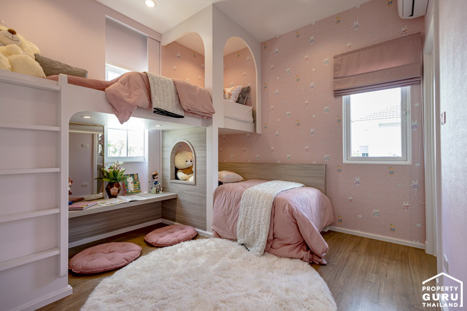 ห้องนอนที่ 3 ห้องนี้ตกแต่งแบบหวานๆ วางตัวอยู่ด้านหลังบ้าน สามารถวางเตียงขนาด 3.5 ฟุต หรือ 5 ฟุต ก็ได้ ภายในห้องมีหน้าต่างบานเลื่อนให้ 1 บาน ความสูงของชั้นนี้อยู่ที่ 2.80 เมตร เท่าชั้น 1 เลยค่ะ