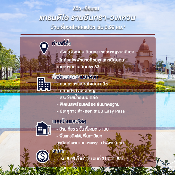 สวัสดีค่ะทุกท่าน วันนี้เราจะพาไปชมบ้านเดี่ยวหลังใหญ่โครงการใหม่ล่าสุด จาก โกลเด้นแลนด์ โครงการนี้มีชื่อว่า แกรนดิโอ รามอินทรา-วงแหวน (Grandio Ramintra-Wongwaen) บ้านที่สร้างด้วยแรงบันดาลใจจากสถาปัตยกรรมสแปนิช ที่ให้ความรู้สึกหรูหรา กับบ้านหลังใหญ่ที่ตอบโจทย์การใช้งานในทุกฟังก์ชัน พร้อมคลับเฮ้าส์ สระว่ายน้ำ หรูหาอลังการ ในทำเลที่ใกล้ทางด่วน 2 สาย และใกล้ห้างสรรพสินค้าแฟชั่นไอส์แลนด์ ในราคาเริ่มที่ 6.99 ล้านบาท ซึ่งจะเปิดให้จองในวันที่ 16-17 พ.ย. นี้ ที่สำนักงานขายโครงการ รายละเอียดจะเป็นไงบ้าง ไปชมกันเลย