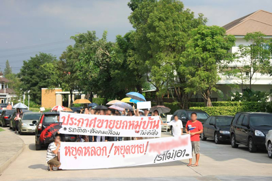 กรณีนี้จะเริ่มรุนแรงขึ้นมาหน่อย สำหรับใครที่อาจจะเจรจาแล้วไม่เป็นผล ก็อาจจะเริ่มมีการประท้วงกับทางโครงการ โดยการติดป้ายขอความเป็นธรรม ซึ่งถ้าหากมีลูกค้าท่านอื่นมาเห็นก็จะทำให้โครงการเสียเครดิตและขายไม่ได้ ก็จะเป็นปัญหาของทางโครงการต้องรีบแก้ไขจุดนั้น ซึ่งก็อาจจะได้ผล หรือไม่ได้ผลก็เกิดขึ้นได้ทั้งนั้น