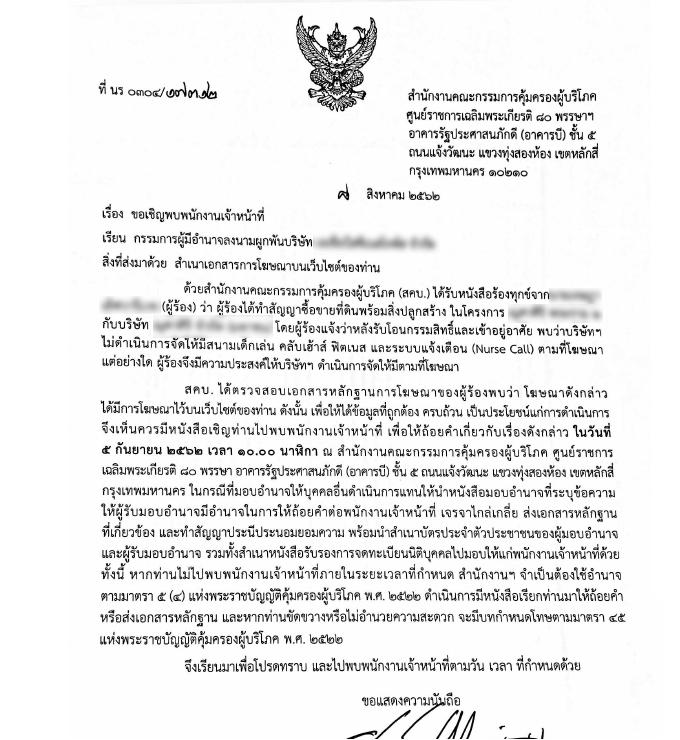 ตัวอย่างเอกสารจาก สคบ. เรียกตัวผู้ที่เกี่ยวข้องกับการโฆษณาให้โครงการนี้