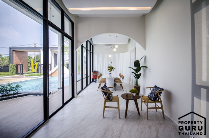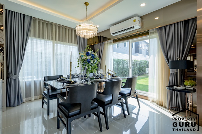ด้านหลังเป็นพื้นที่วางโต๊ะรับประทานอาหาร ซึ่งสามารถวางโต๊ะใหญ่ได้ ในบ้านตัวอย่างวางไว้แบบ 6 ที่นั่ง แต่พื้นที่จริงๆ นั้นสามารถรองรับได้ถึง 8 ที่นั่งเลยทีเดียวค่ะ และยังมีประตูบานเลื่อน กระจกใสเขียวตัดแสงอยู่ด้านข้าง สามารถเข้า-ออกได้ และรับแสงสว่างให้กับตัวบ้านได้ นอกจากนี้บานหน้าต่างก็ใหญ่อีกด้วย