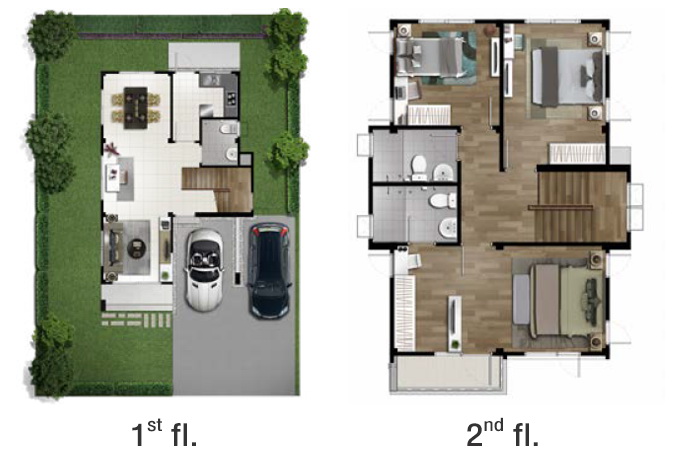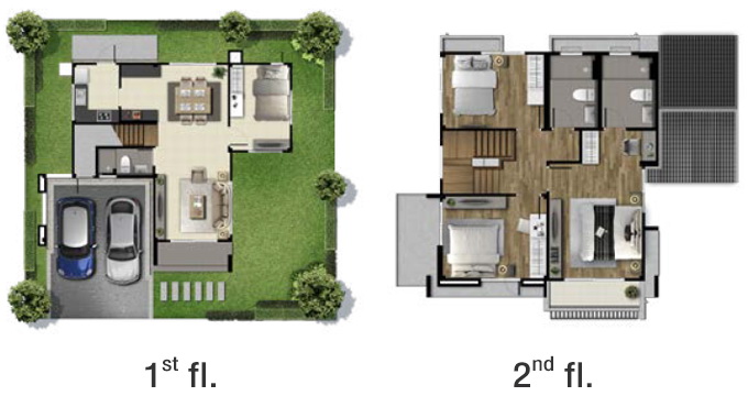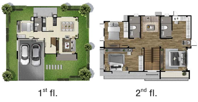 2. แบบบ้าน Alexia บ้านเดี่ยว 2 ชั้น พื้นที่ใช้สอย 154 ตร.ม. 3 ห้องนอน 3 ห้องน้ำ 1 ห้องนั่งเล่น 1 ห้องรับประทานอาหาร 1 ห้องครัว 1 ห้องเก็บของ ที่จอดรถ 1 คัน (ในร่ม) 1 คัน (กลางแจ้ง)