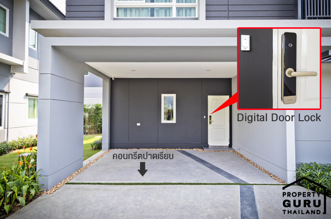บริเวณที่จอดรถ สามารถจอดรถในร่มได้ 2 คัน ตรงพื้นเป็นคอนกรีตปาดเรียบ ซึ่งจะมีประตูทางเข้าบ้านอยู่ตรงที่จอดรถนี้ด้วยบานจับประตูเป็น Digital Door Lock