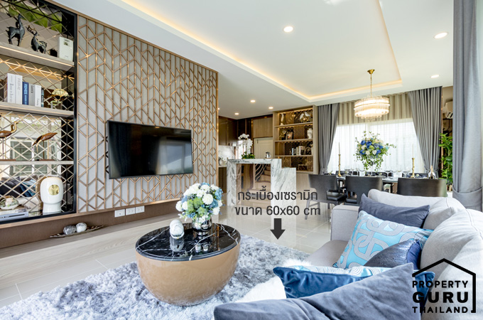 พื้นชั้น 1 เป็นกระเบื้องเซรามิก ขนาด 60x60 ซม.