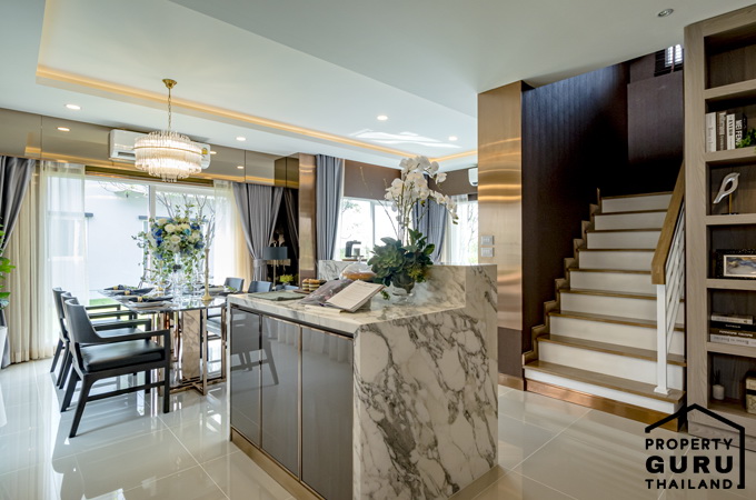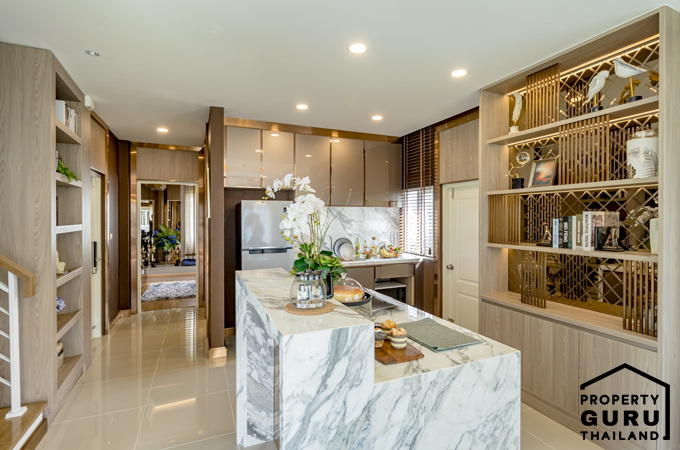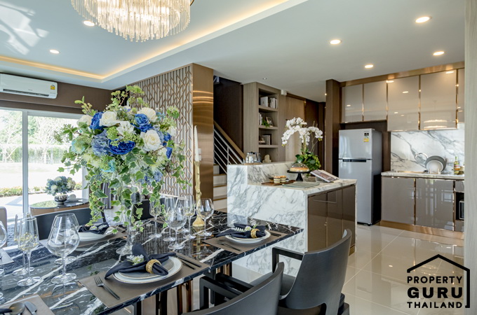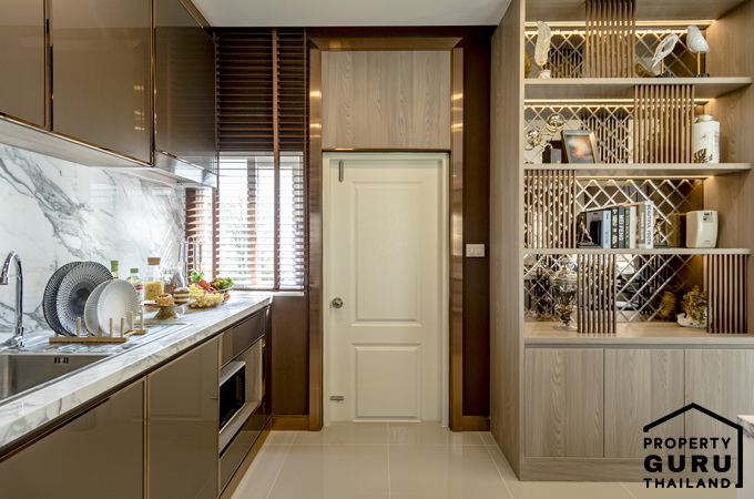 บรรยากาศห้องครัวของบ้านตัวอย่างทำเป็นครัวเปิด บ้านจริงจะได้เป็นครัวปิด กั้นเป็นห้องให้