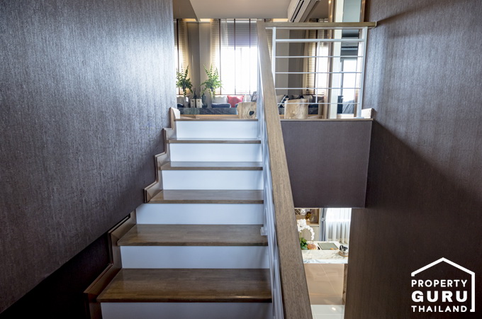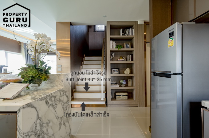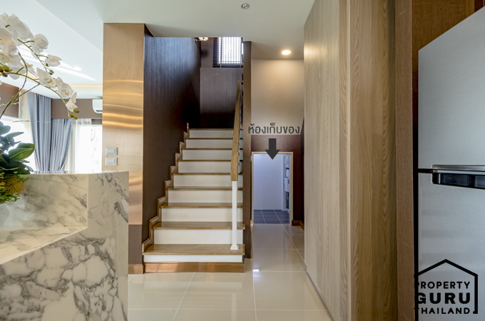 บันไดบ้านเป็นโครงบันไดเหล็กสำเร็จ ด้านข้างที่เห็นเป็นตู้ จริงๆ แล้วเป็นประตูที่โครงการต่อเติมไว้