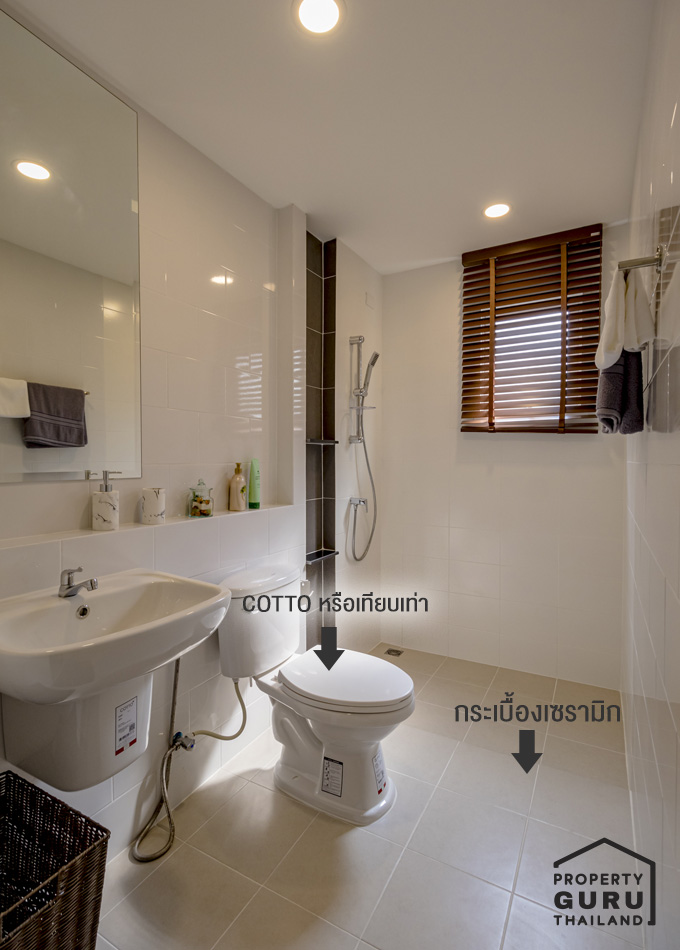 ห้องน้ำชั้นล่างหน้าตาแบบนี้ พื้นเป็นกระเบื้องเซรามิก สุขภัณฑ์ Cotto หรือเทียบเท่า และมีแบ่งส่วนแห้งส่วนเปียกด้วยพื้นต่างระดับ