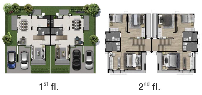 1. แบบบ้าน Sol บ้านแฝด 2 ชั้น เนื้อที่ดินเริ่มต้น 35 ตร.ว. พื้นที่ใช้สอย 148 ตร.ม. 3 ห้องนอน 3 ห้องน้ำ 1 ห้องนั่งเล่น 1 ห้องรับประทานอาหาร 1 ห้องครัว 1 ห้องเก็บของ ที่จอดรถ 1 คัน (ในร่ม) 1 คัน (กลางแจ้ง)