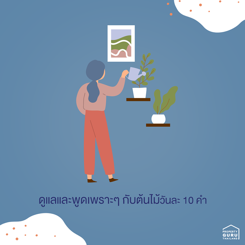 ได้ยินมาว่าการพูดเพราะๆ กับต้นไม้วันละ 10 คำ จะทำให้ต้นไม้เจริญเติบโตดี อันนี้จริงหรือไม่จริงก็คงต้องลองดูนะคะ แต่ที่จริงแน่ๆ เลยก็คือการที่เรามีเวลาให้ต้นไม้มากขึ้น ไม่ว่าจะเป็นใส่ปุ๋ย เด็ดใบเหี่ยวๆ ออก แน่นอนว่ามันต้องสวยกว่าไม่ดูแลอยู่แล้ว ช่วงเวลาที่เรารีบไปทำงาน มีธุระออกไปข้างนอกไม่เว้นแต่ละวัน เราปล่อยให้ต้นไม้ดูแลตัวเองมานานแล้ว ช่วงนี้มีเวลาว่างก็ลองปลูกต้นไม้ ขยายพันธุ์ ใส่ปุ๋ยให้เค้าหน่อย เค้าจะได้อยู่กับเรานานๆ