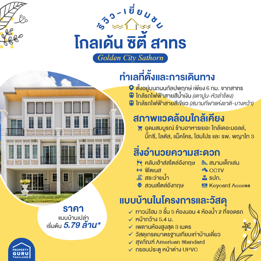 วันนี้ CheckRaka.com ขอพาทุกท่านไปเยี่ยมชมโครงการของ โกลเด้นแลนด์ กันค่ะ ซึ่งเป็นทาวน์โฮมพร้อมอยู่ระดับพรีเมียม โกลเด้น ซิตี้ สาทร (Golden City Sathorn) ขนาด 3 ชั้น 5 ห้องนอน 4 ห้องน้ำ 2 ที่จอดรถ สไตล์อังกฤษ พื้นที่ใช้สอยกว้าง 168 ตารางเมตร บนทำเลที่ใกล้เมืองมากๆ อยู่ต้นถนนกัลปพฤกษ์ เพียง 6 กม. จากสาทร และเพียง 1.5 กม. จากรถไฟฟ้า BTS วุฒากาศ ใกล้ทางด่วนพิเศษศรีรัช และแวดล้อมด้วยห้างสรรพสินค้า มาพร้อมคลับเฮ้าส์ สระว่ายน้ำ และสวนสีเขียวภายในโครงการ ได้ครบขนาดนี้ในราคา 5 ล้านนิดๆ จะสวยงามขนาดไหนตามไปชมกันเลยค่ะ