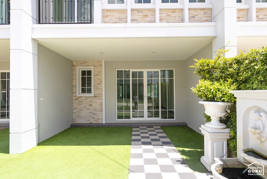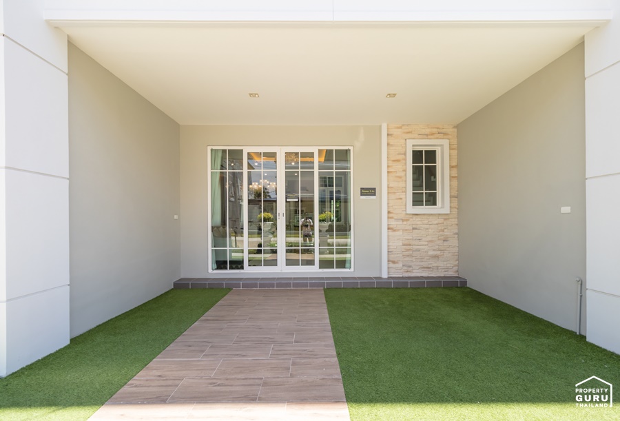 หน้ากว้าง 5.4 เมตร จอดรถได้ 2 คัน ทางโครงการปูหญ้าเทียมมาให้ดูเป็นไอเดีย