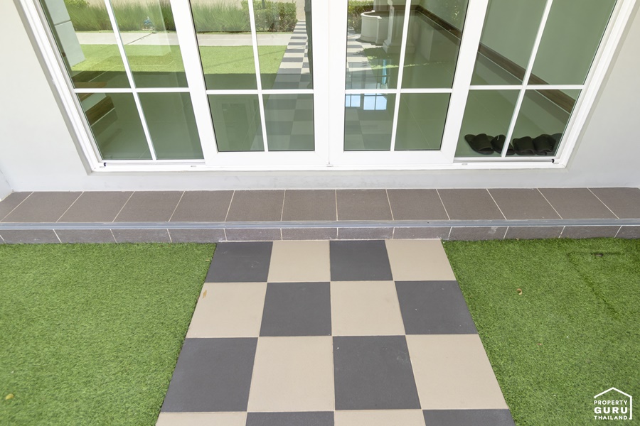 พื้นปูด้วยหญ้าจริง ทางเดินออกแบบเป็นคอนกรีตแผ่นใหญ่เดินได้สะดวก