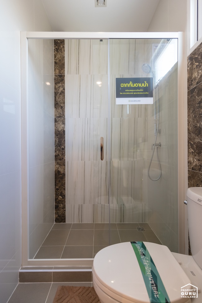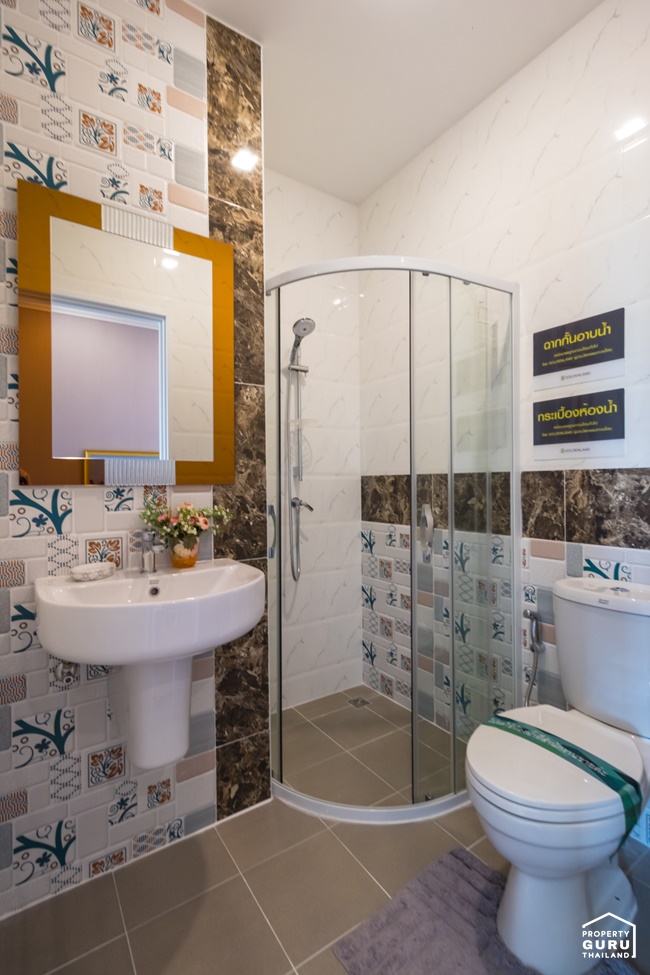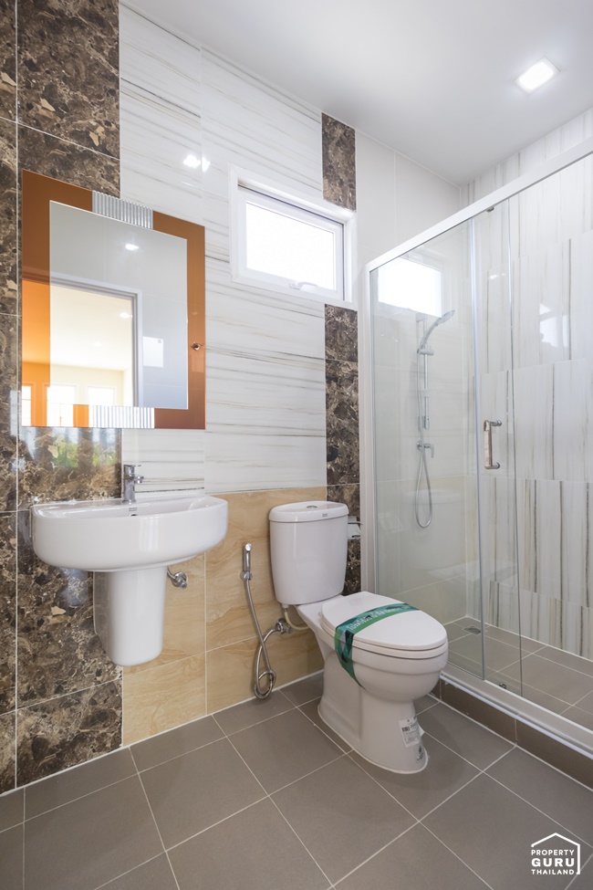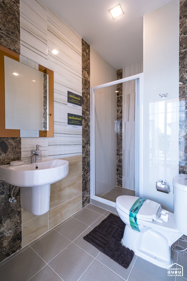 ภายในห้องน้ำแบ่งพื้นที่ส่วนแห้งส่วนเปียกชัดเจน ได้ฟังก์ชันการใช้งานครบ ทั้งอ่างล้างหน้า โถสุขภัณฑ์และฉากกั้นอาบน้ำ