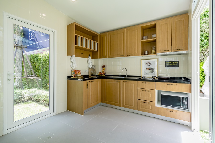 ทางโครงการตกแต่งเป็นครัวไทยแยกส่วน พร้อม Built-in เป็นชุดเคาน์เตอร์ครัว L-Shape มาให้ดูเป็นไอเดีย
