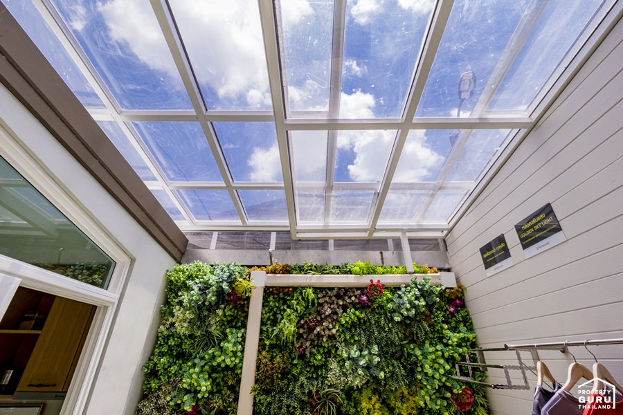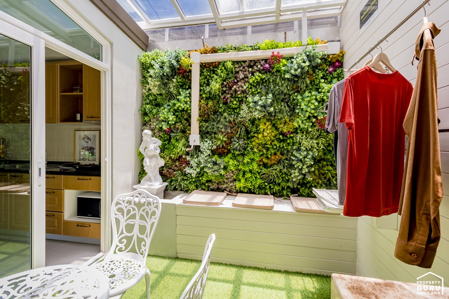 ผนังบางส่วนตกแต่งเป็นมุมนั่งเล่นเล็กๆ ด้วย Green Wall
