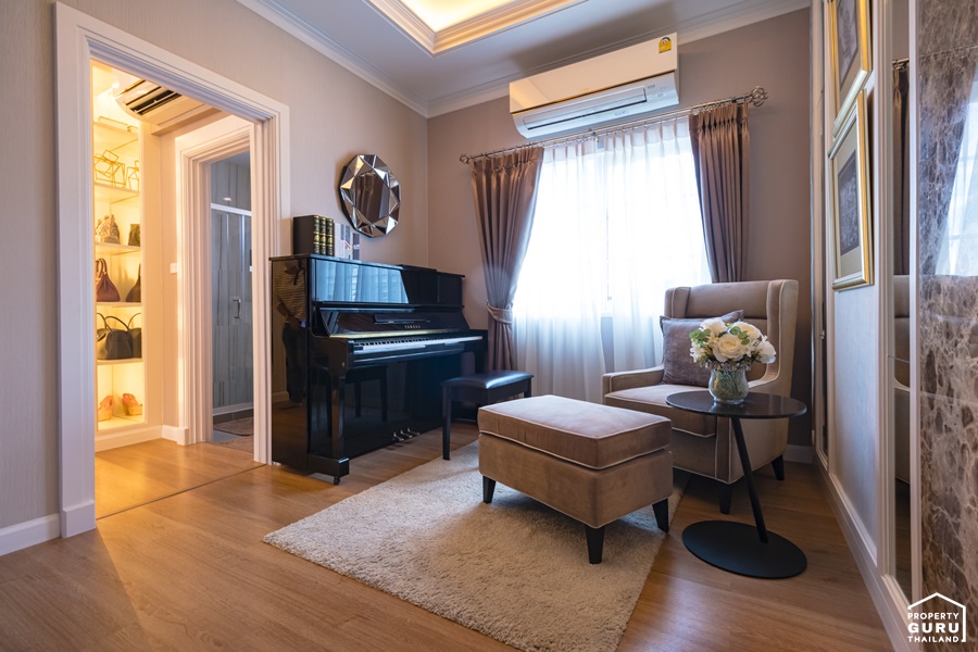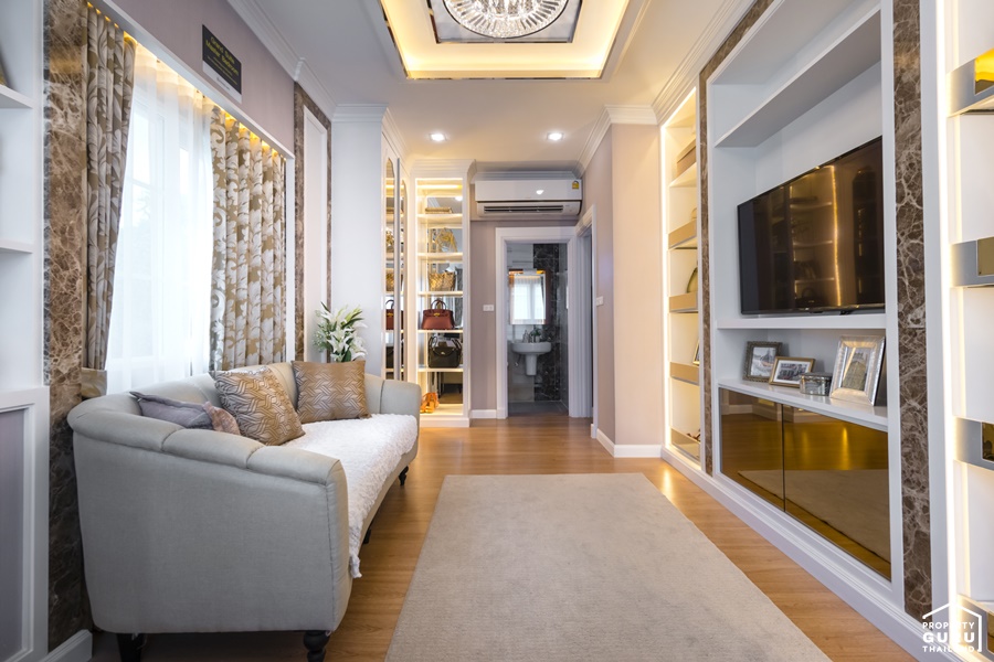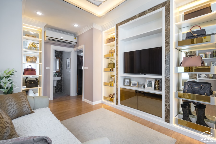 ภายในห้องสามารถจัดวางโซฟาขนาด 2 ที่นั่ง ฝั่งตรงข้าม Built-in เป็นชั้นวางของ ชั้นวางทีวีให้ดูเป็นไอเดีย