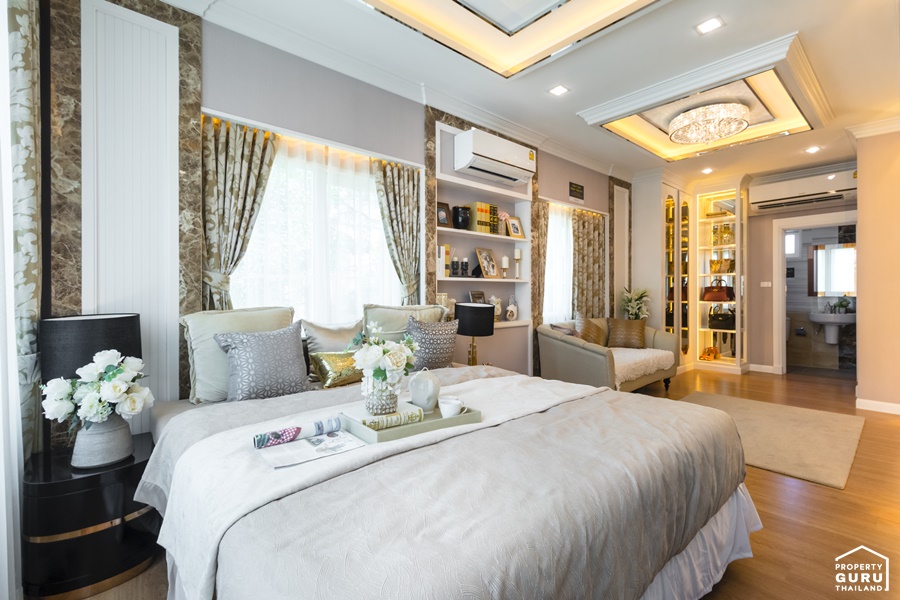 และห้องสุดท้ายคือห้อง Master Bedroom ห้องนี้จะวางตัวอยู่ฝั่งด้านหน้าบ้าน โดดเด่นด้วยห้องเพดานสูง 3 เมตร